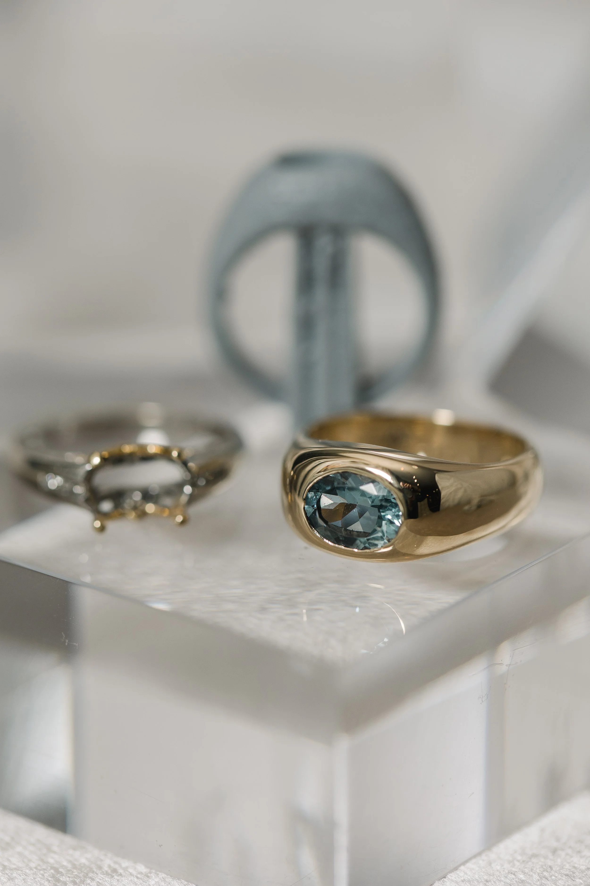 When our client first visited us about this design idea, we knew it was an extremely meaningful project for her. The original aquamarine ring had been given to her by her mother who had passed away and it had taken time for our client to feel ready to redesign the setting. The ring felt a bit traditional and dated for our client’s aesthetic and she wanted a design that she could wear confidently every day. We love how impactful the design is, yet it feels streamlined and minimalist for daily wear.