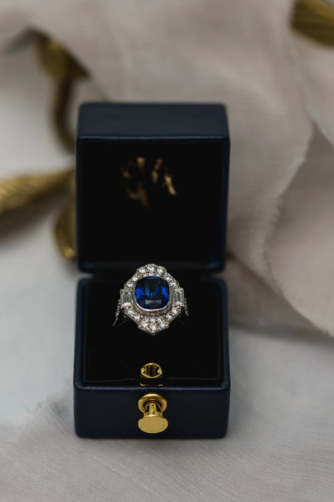 Art Deco is a term that I hear discussed a lot, but not always quite accurately. True Art Deco design was usually done in platinum, often included sapphire accents, and pretty much always involves symmetry, clean lines, and a “reaching” design evoking light sprays, skyscrapers, and other linear geometric influences. Art Deco is very different from minimalist - in fact, it often features very intricate filigree or engraving. Art Deco jewelry was a celebration of color, vibrancy, progressivism, and wealth and modern pieces that reference this often have bespoke elements such as custom cut gemstones or intricate engraving.