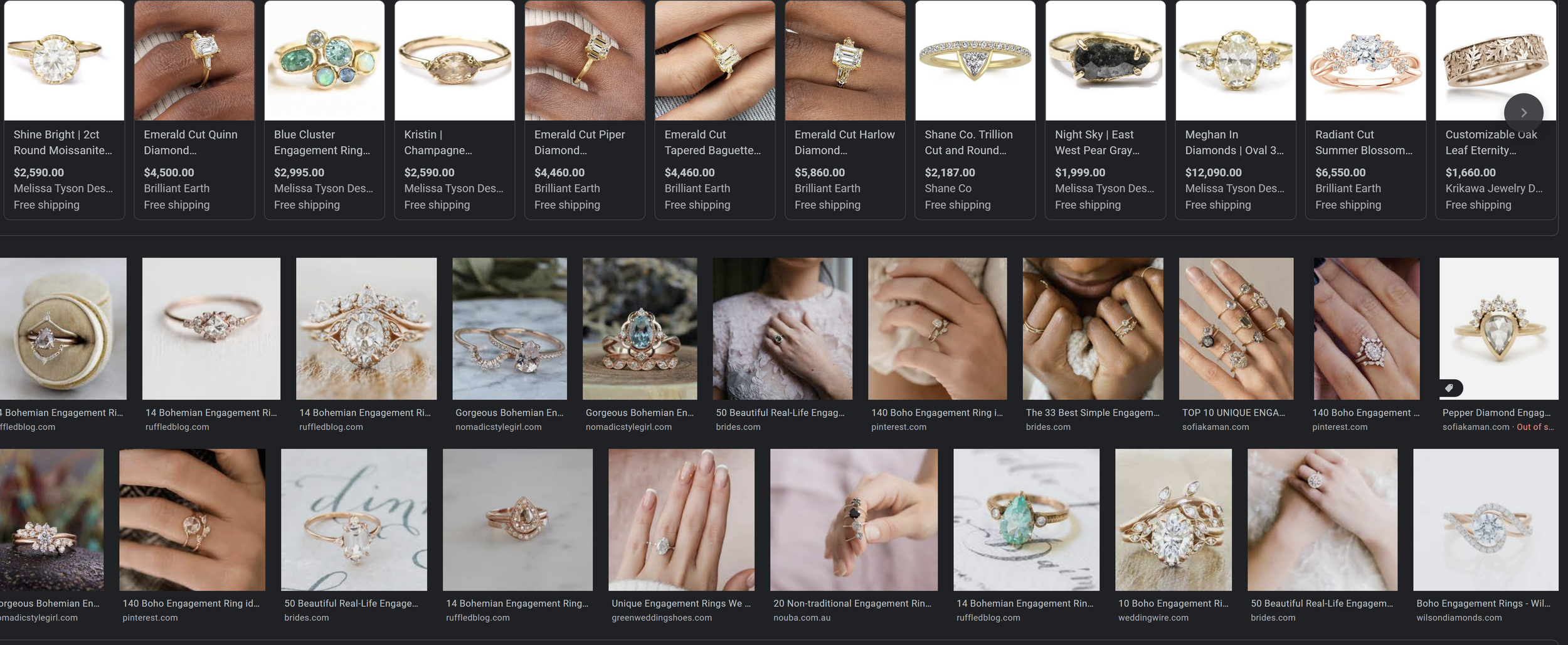 The simplest way to get started is to simply start Googling. Make a folder where you save images of rings or jewelry that you see and like - but also include pieces you don’t like! This can be just as (if not more) useful since we need to see what doesn’t look right to you in order to understand what looks right. What search terms should you use? Here are my suggested starters: